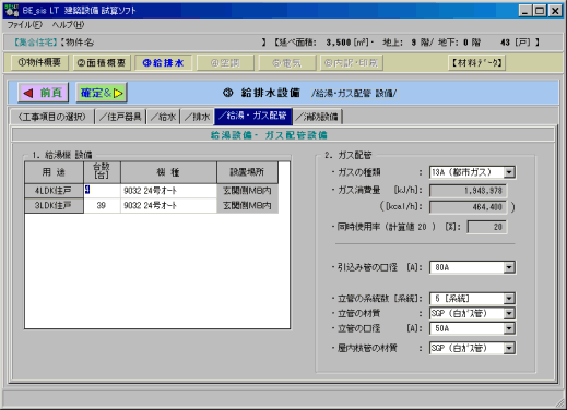 このページでは、給湯設備と、ガス配管設備の概要を入力します。
