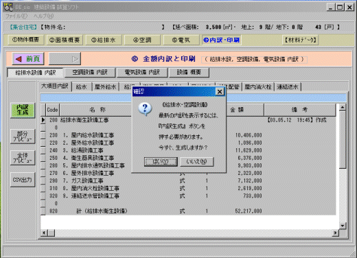 『内訳生成』 ・・・・ 給排水・空調または、 電気設備の 内訳・概要を生成する