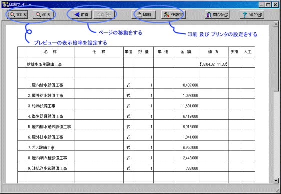 『全体プレビュー』 ・・・・ 給排水・空調または、 電気設備の 内訳のプレビューと印刷